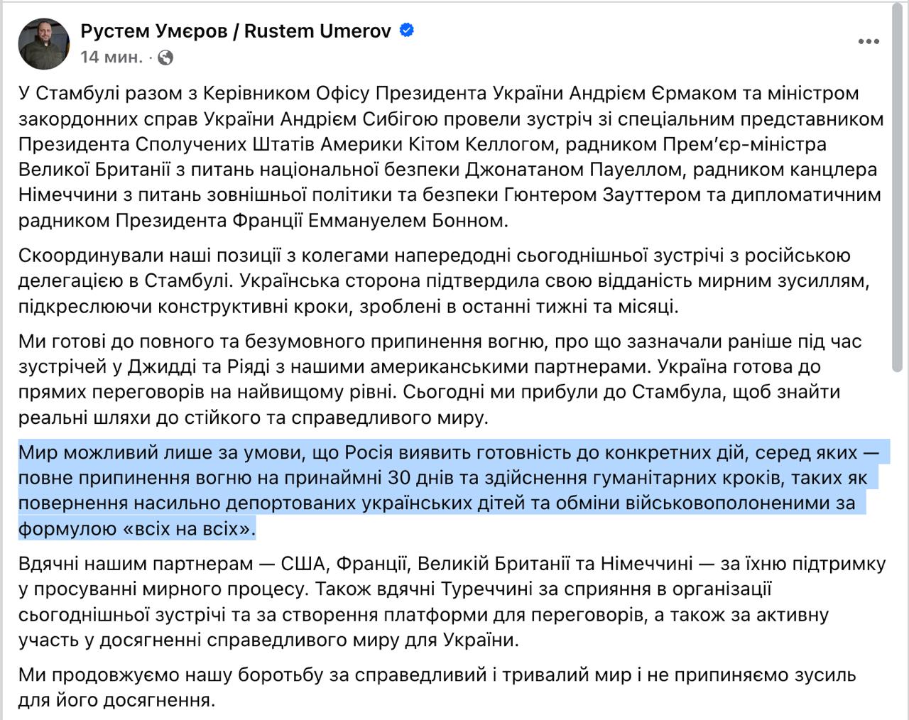 "Мир возможен только при условии, что Россия проявит готовность к конкретным действиям, среди которых полное прекращение огня по крайней мере 30 дней и осуществление гуманитарных шагов, таких как возвращение насильственно депортированных украинских детей и обмены военнопленными по формуле "всех на всех", - написал министр обороны после встречи с представителями Европы и США.