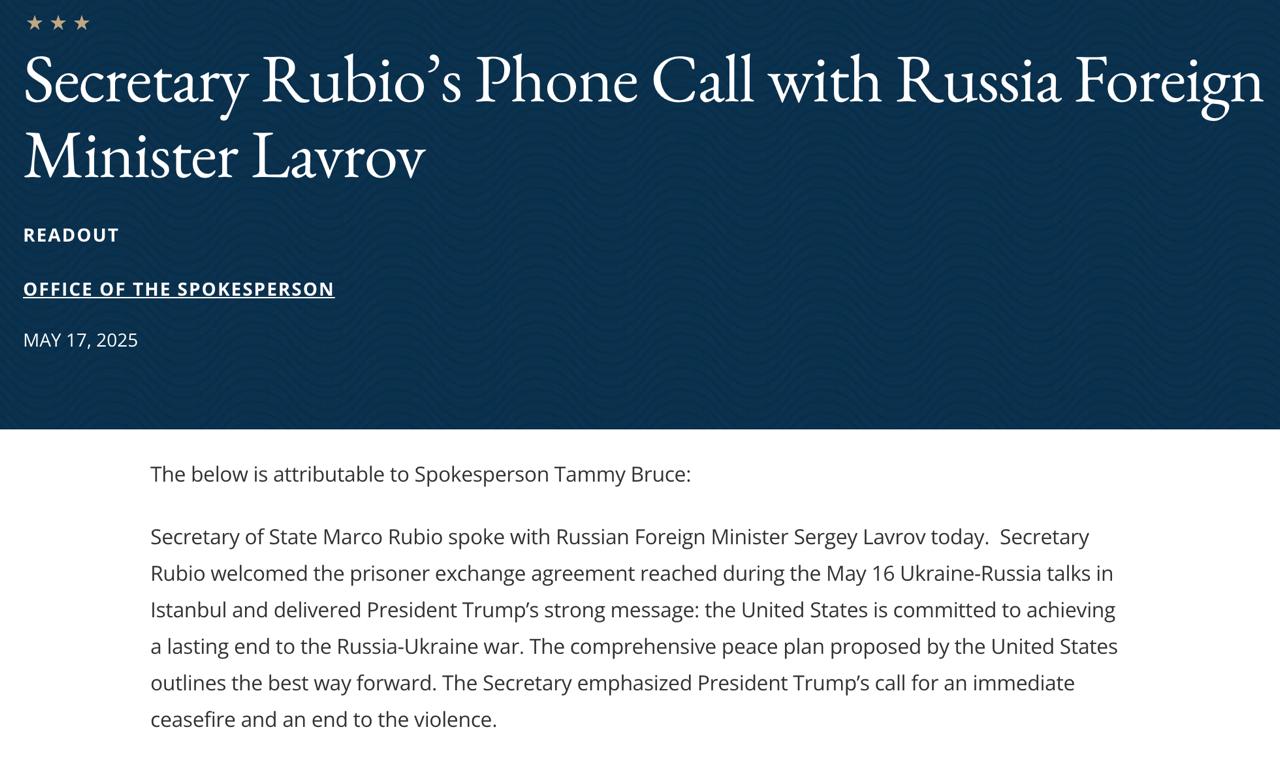 "Госсекретарь Рубио приветствовал соглашение об обмене пленными, достигнутое в ходе российско-украинских переговоров 16 мая в Стамбуле, и передал решительное послание президента [США Дональда] Трампа: Соединенные Штаты привержены достижению устойчивого завершения российско-украинской войны. Всеобъемлющий мирный план, предложенный Соединенными Штатами, представляет собой наилучший способ продвижения вперед", - говорится в письменном заявлении руководителя пресс-служб Госдепартамента Тэмми Брюс.