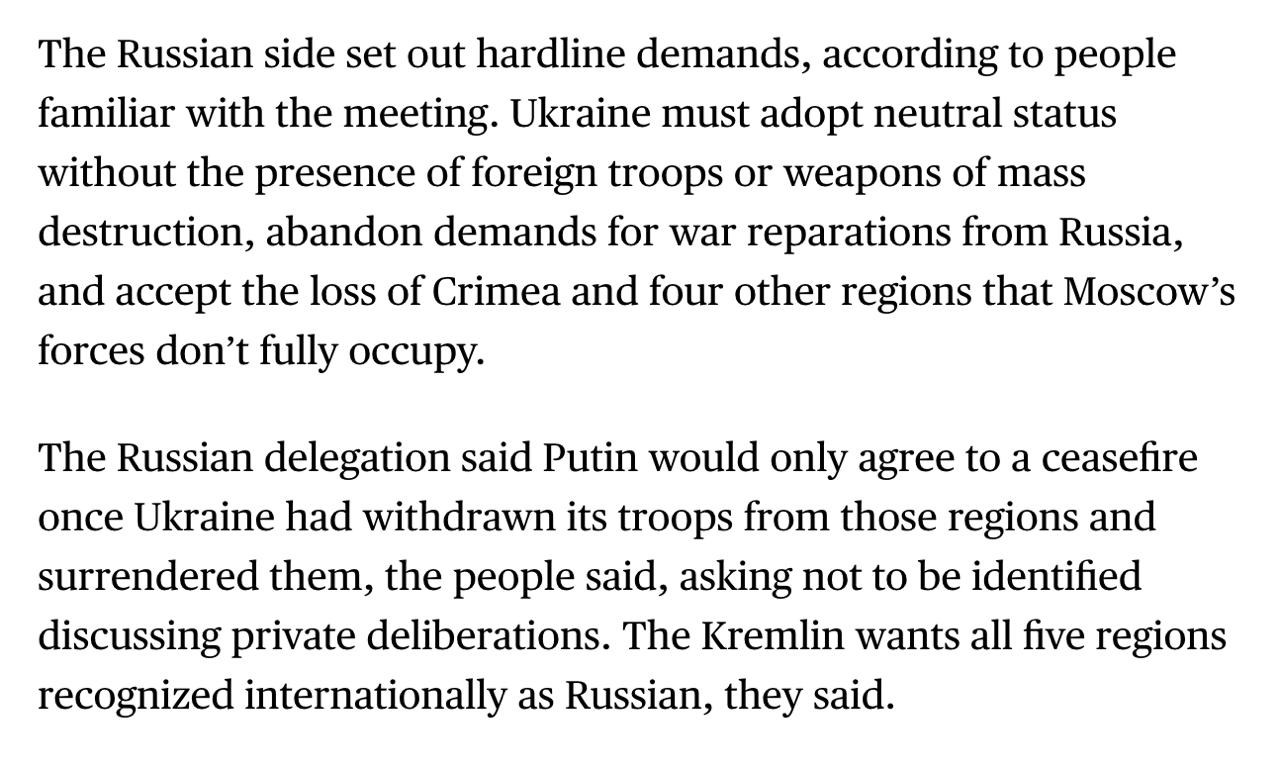 Напомним, ранее похожие требования от РФ на переговорах в Турции публиковали со ссылкой на источники и другие СМИ.