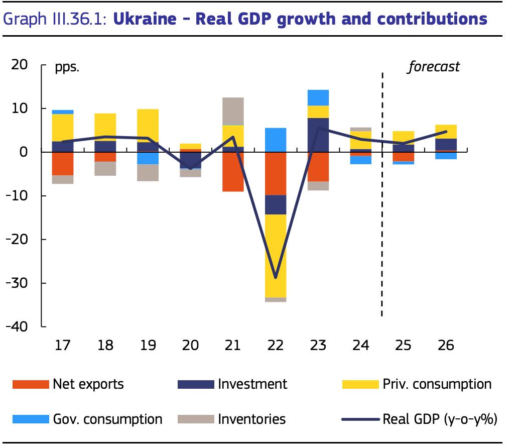 Европейская комиссия ухудшила прогноз роста ВВП Украины в этом году до 2% с ожидаемых в ноябре 2,8%. На следующий год прогноз ухудшился с 5,9% до 4,7%.