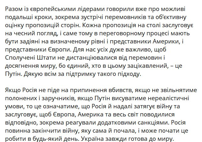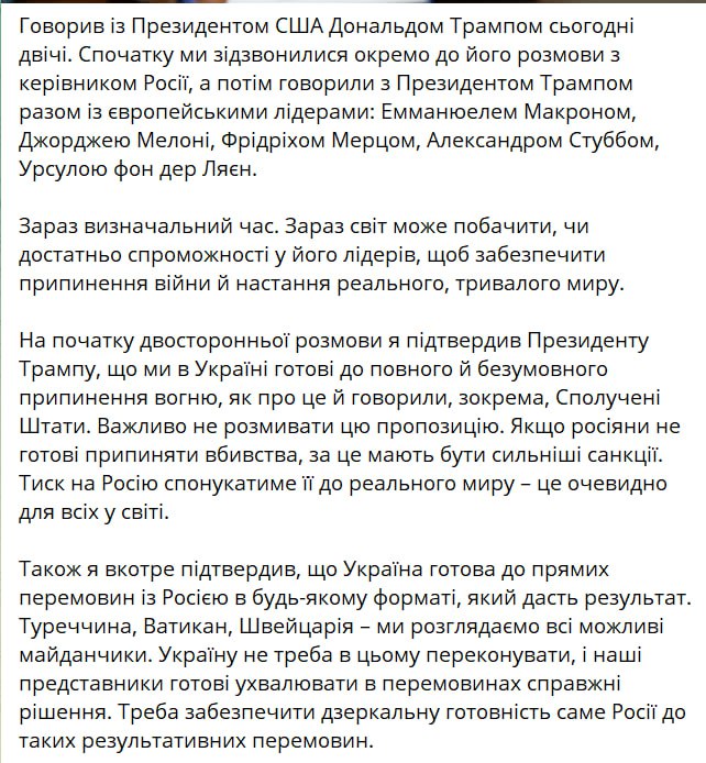 "В начале двустороннего разговора я подтвердил президенту Трампу, что мы в Украине готовы к полному и безусловному прекращению огня, как об этом и говорили, в частности, Соединенные Штаты. Важно не размывать это предложение. Если россияне не готовы прекращать убийства, за это должны быть более сильные санкции. Давление на Россию будет побуждать ее к реальному миру – очевидно для всех. Также я еще раз подтвердил, что Украина готова к прямым переговорам с Россией в любом формате, который даст результат. Турция, Ватикан, Швейцария – мы рассматриваем все возможные площадки. Украину не нужно в этом убеждать, и наши представители готовы принимать в переговорах настоящие решения. Надо обеспечить зеркальную готовность России к таким результативным переговорам", – сообщил он о первом разговоре.