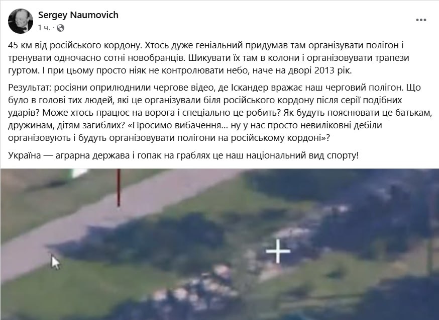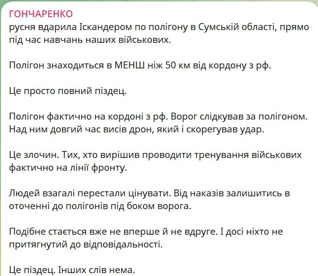 "Россияне ударили "Искандером" по полигону в Сумской области, прямо во время учений наших военных. Полигон находится в менее чем 50 км от границы с РФ. Это просто полный пи@@ец. Полигон практически на границе с РФ. Враг следил за полигоном. Над ним долгое время висел дрон, который и скорректировал удар. Это преступление решивших проводить тренировки военных фактически на линии фронта", – написал он.