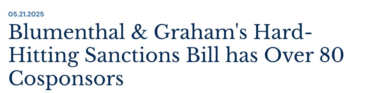 То, что в Конгрессе могут попытаться поставить на голосование законопроект о жестких санкциях против РФ, мы предполагали ещё в понедельник - после разговора Трампа с Путиным, после которого президент США дал понять, что не намерен вводить санкции против РФ, хотя Кремль и отказывается от безусловного прекращения огня, настаивая на предварительных переговорах (и Трамп эту позицию в своих комментариях поддержал).