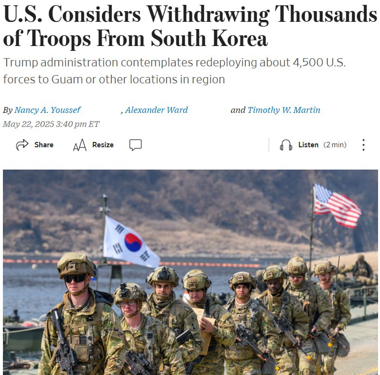Как сказано в статье, начиная со своего первого срока президент Дональд Трамп рассматривал возможность изменить присутствие американских войск в Южной Корее, где расквартированы около 28,5 тысяч военнослужащих США.