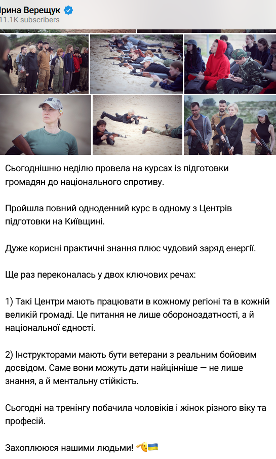 Заместитель главы Офиса президента Ирина Верещук сообщила, что воскресенье, 25 мая, провела на курсах подготовки граждан к национальному сопротивлению.