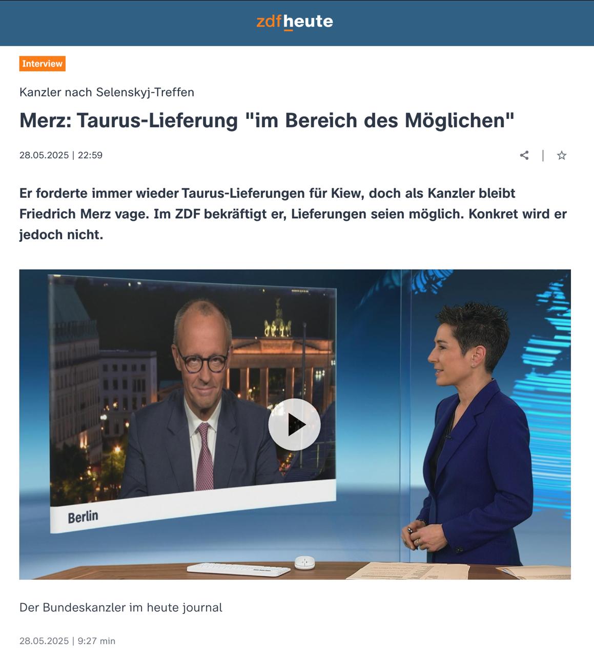 15:52 Президент Зеленский, так же как и канцлер Германии Мерц, продолжают сохранять "стратегическую неопределённость" вопроса поставок Украине ракет Taurus.