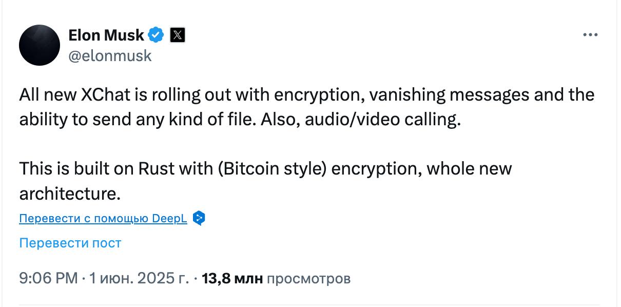 Маск утверждает, что "XChat" защищен новым способом шифрования, а также позволяет совершать аудио-видео звонки, не используя номер телефона, отправлять исчезающие сообщения и файлы.