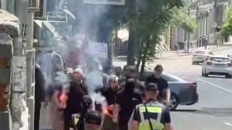 При этом к месту проведения мероприятия уже подошла колонна националистов, в руках у которых были подожженные факелы.