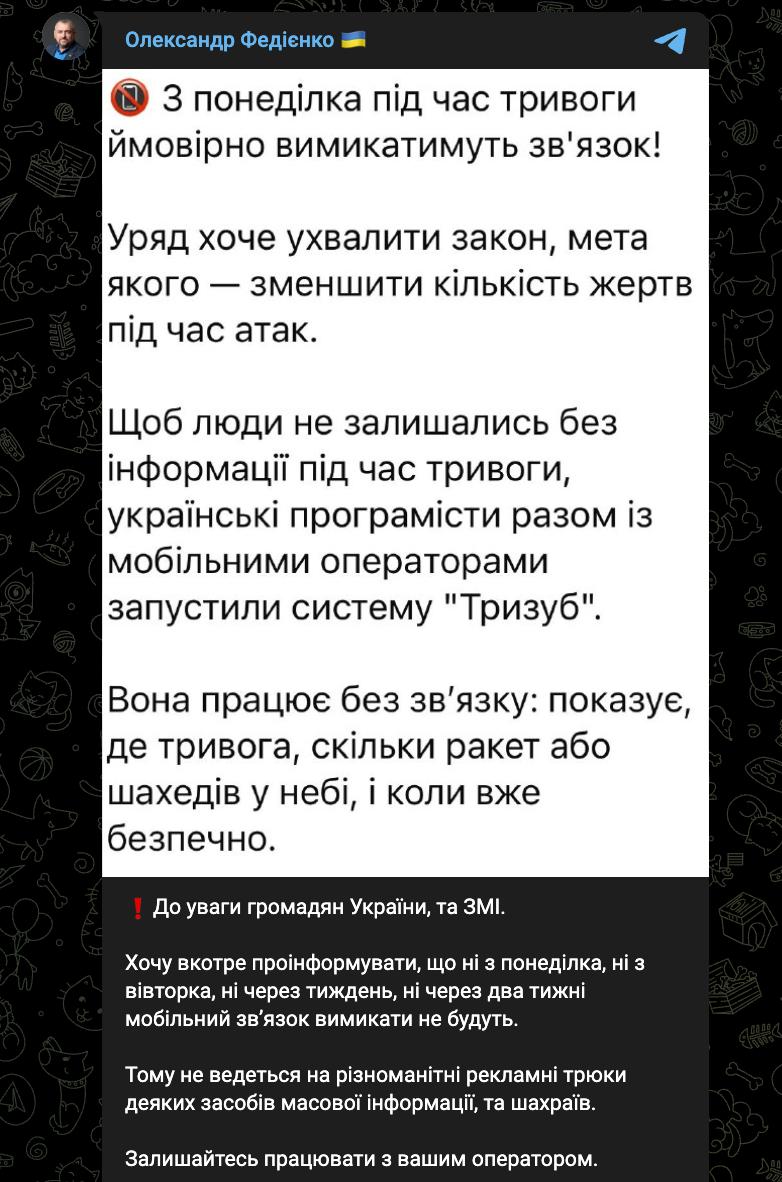21:59 Нардеп Александр Федиенко отрицает планы отключать мобильную связь при атаках "Шахедов".