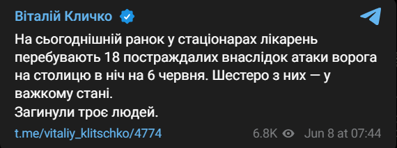 08:00 На сегодняшня в стационарах больниц находятся 18 пострадавших в результате атаки РФ на Киев в ночь на 6 июня, сообщил мэр столицы Виталий Кличко.