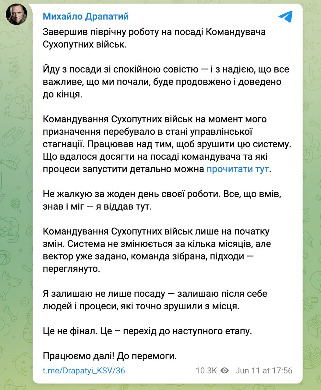 Напомним, что Драпатый объявил о своей отставке из-за прилета по военным на полигоне и раскритиковал круговую поруку в армии, после чего был назначен командующим Объединенными силами.