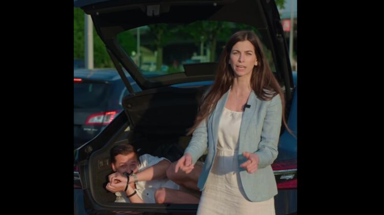 В ролике Александра стоит возле машины, в багажнике которой лежит связанный мужчина. Сенткирайи утверждает, что после присоединения Украины в ЕС в Венгрию хлынут торговцы органами, наркотиками и людьми.