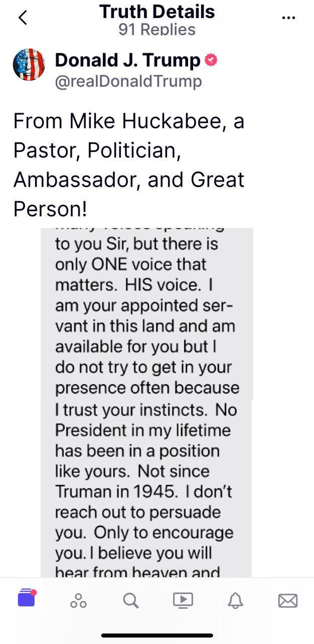 "Есть только один голос, который действительно имеет значение. Его голос. Я — ваш назначенный слуга на этой земле и всегда к вашим услугам, но стараюсь не слишком часто искать встречи с вами, потому что доверяю вашей интуиции. Ни один президент за мою жизнь не оказывался в такой позиции, как вы. Не было такого со времен Трумэна в 1945 году. Я не обращаюсь к вам, чтобы убедить вас. Только чтобы поддержать. Я верю, что вы услышите небеса и…" - написал Хакаби, которого Трамп назвал "прекрасным человеком".