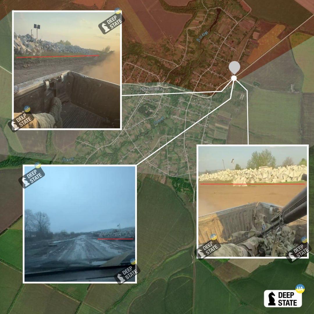 Он публикует фото строительных материалов, которые просто лежали с зимы в районе Юнаковки и теперь их смогут использовать для своих укреплений россияне.