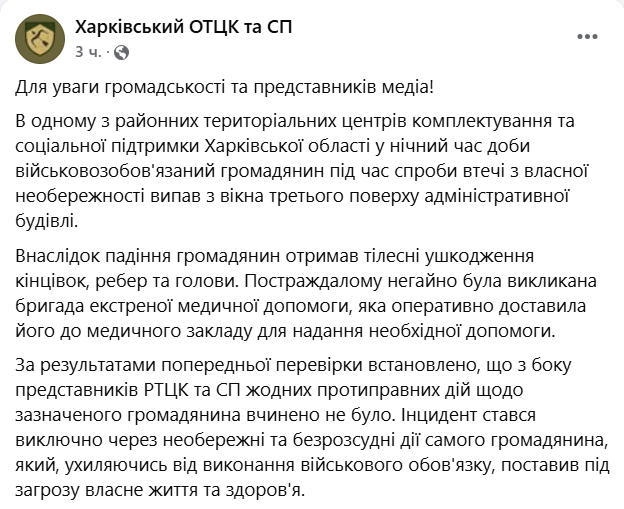 При этом в ТЦК заявляют, что с их стороны никаких противоправных действий не было, а "инцидент произошел исключительно из-за неосторожных и безрассудных действий самого гражданина, который, уклоняясь от выполнения воинского долга, поставил под угрозу собственную жизнь и здоровье".