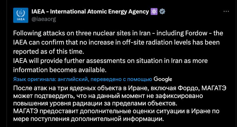 "После атак на три ядерных объекта в Иране, включая Фордо, МАГАТЭ может подтвердить, что на данный момент не зафиксировано повышения уровня радиации за пределами объектов", - сообщило агентство.