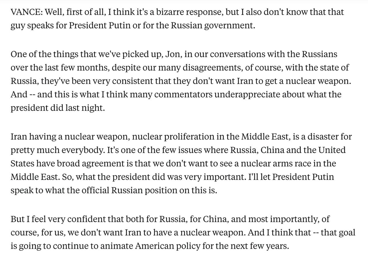 "Это один из немногих вопросов, по которому Россия, Китай и США имеют широкое согласие. Мы не хотим видеть гонку ядерных вооружений на Ближнем Востоке", - сказал Вэнс.