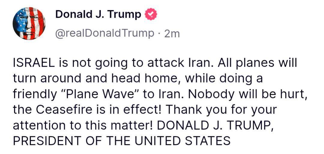 "Израиль не собирается атаковать Иран. Все самолеты развернутся и направятся домой, выполняя дружеский "самолетный салют" Ирану. Никто не пострадает, перемирие действует!" - написал президент США.