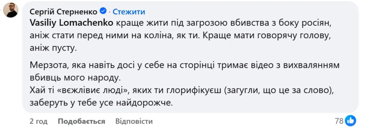 Притула и Стерненко раскритиковали за это пост спортсмена: первый назвал Ломаченко "трусом" и потребовал от него выйти из украинского гражданства, а второй назвал боксера "ссыкуном" и "предателем".