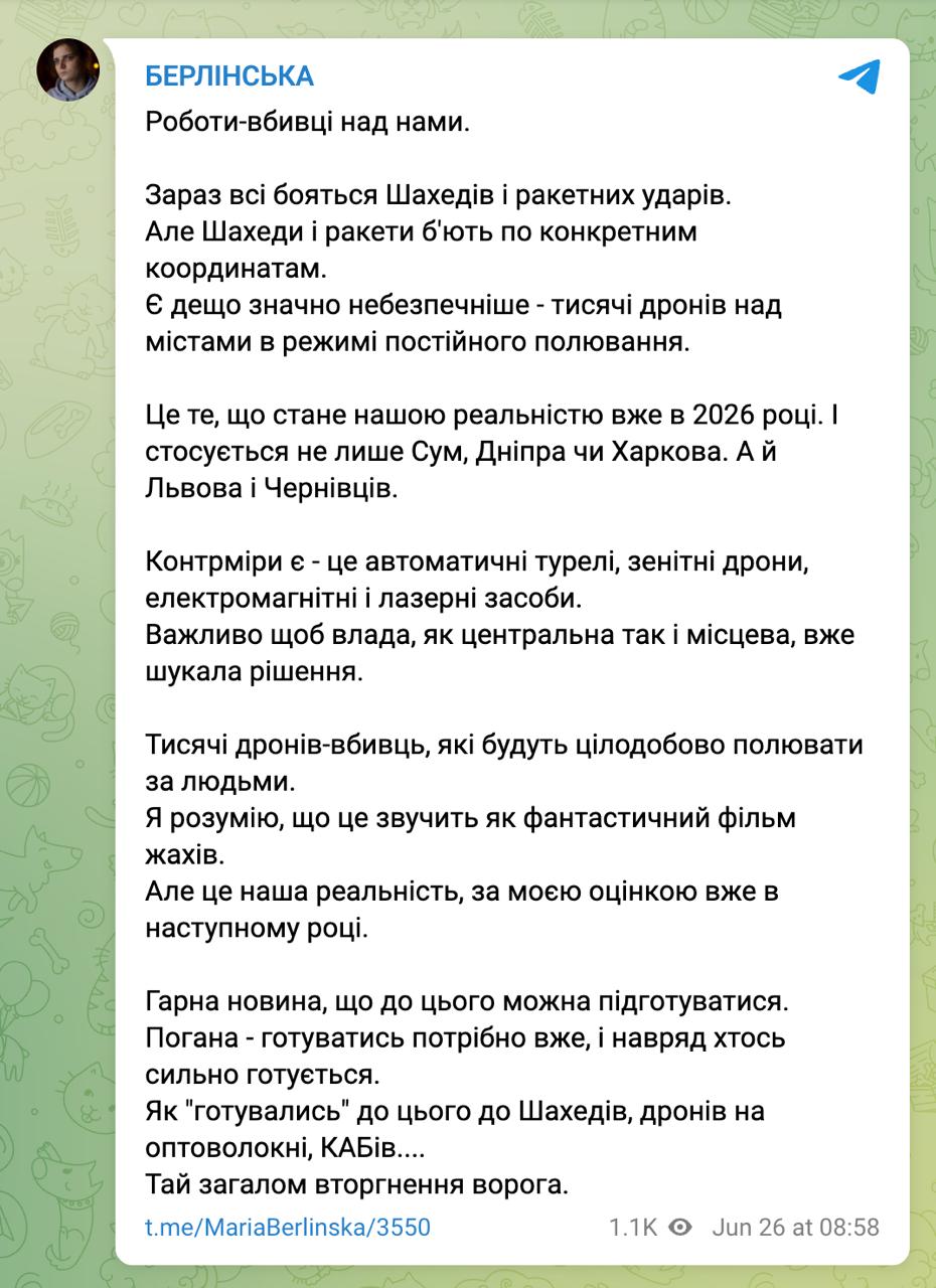"Тысячи дронов-убийц, которые будут круглосуточно охотиться за людьми. Я понимаю, что это звучит как фантастический фильм ужасов. Но это наша реальность, по моей оценке, уже в следующем году. И касается не только Сум, Днепра или Харькова. Но и Львова и Черновцов", - пишет Берлинская.