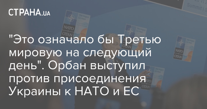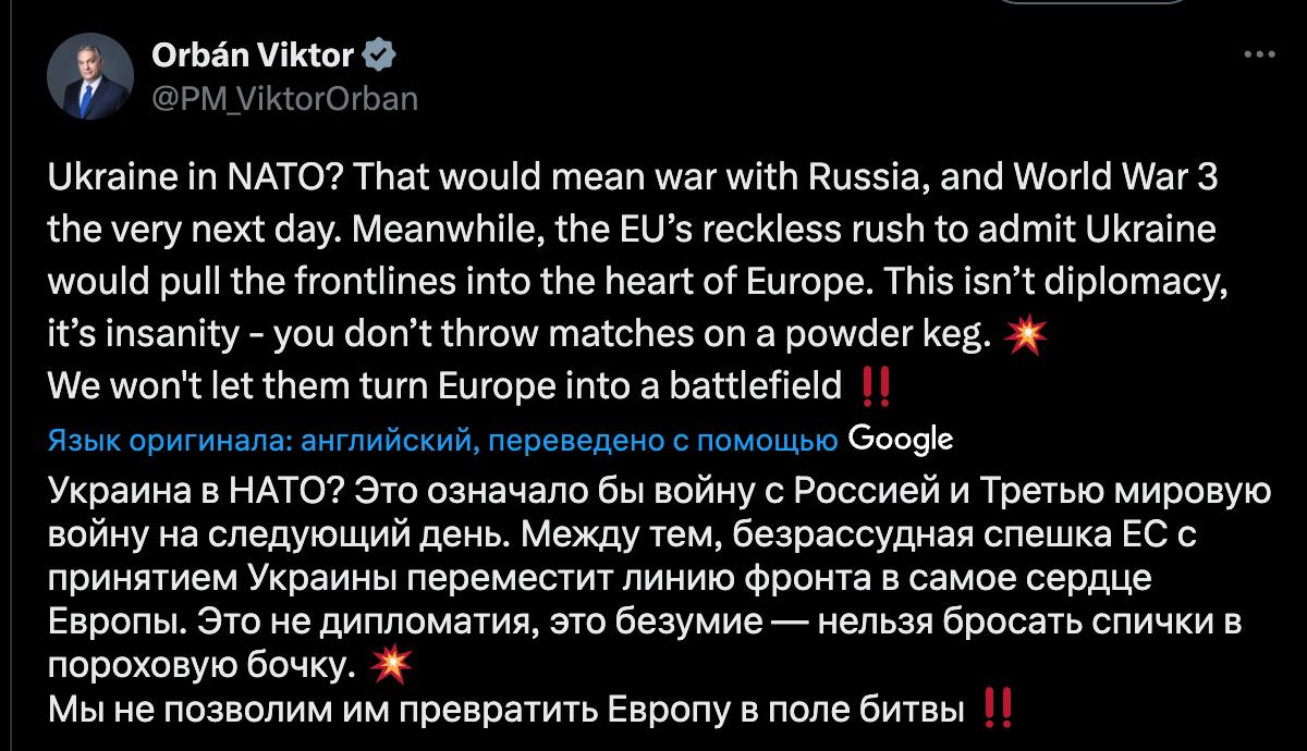 "Украина в НАТО? Это означало бы войну с Россией и Третью мировую войну на следующий день. Между тем, безрассудная спешка ЕС с принятием Украины переместит линию фронта в самое сердце Европы. Это не дипломатия, это безумие - нельзя бросать спички в пороховую бочку. Мы не позволим им превратить Европу в поле битвы", - сообщил Орбан.