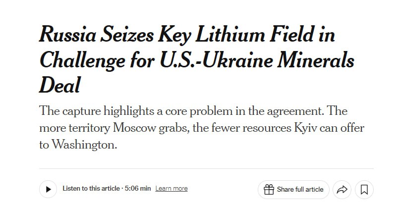 "Захват месторождения Шевченко подчеркивает основную проблему для сделки. Чем больше территории российские войска захватывают в Украине, тем меньше ресурсов Киев может предложить Вашингтону", – говорится в статье.