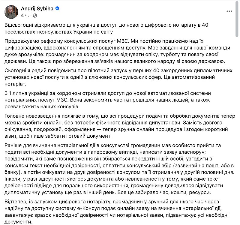 "Все процедуры подачи и обработки документов теперь можно сделать онлайн, без необходимости физического посещения дипломатического представительства. Вместо долгого ожидания, поездок, оформления теперь удобная онлайн-процедура и впоследствии короткий визит, чтобы только забрать готовый документ", - написал Сибига.