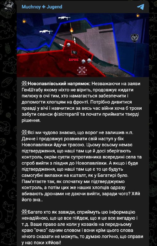 Мучной утверждает, что на данный момент нет достоверных подтверждений присутствия украинских сил в Дачном, а вот активность российских войск наблюдается как внутри населенного пункта, так и поблизости: они пытаются выйти к Новопавловке с юга.