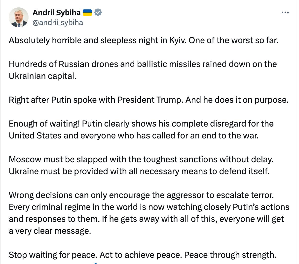 "Абсолютно ужасная и бессонная ночь в Киеве. Одна из худших за все время. Сразу после того, как Путин поговорил с президентом Трампом. И он делает это специально. Хватит ждать! Путин явно демонстрирует свое полное пренебрежение к Соединенным Штатам и всем, кто призывал к прекращению войны", - написал Сибига.