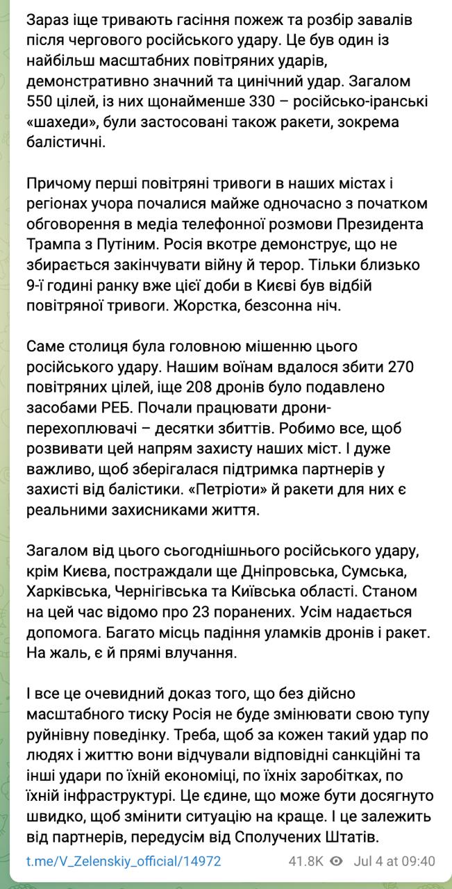 Глава МИД Украины Андрей Сибига в свою очередь связал ночную атаку Киева с вчерашним разговором президентов РФ и США Владимира Путина и Дональда Трампа.