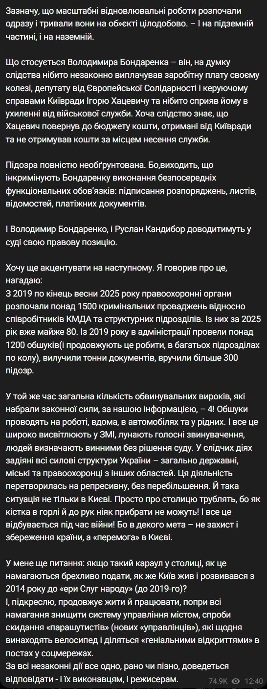 По словам Кличко, обвинения Кандибора в служебной халатности – "абсолютно манипулятивны", а в затоплении участка метро в 2023 году обвиняет ответственных за его строительство в 2008-2010-х годах.