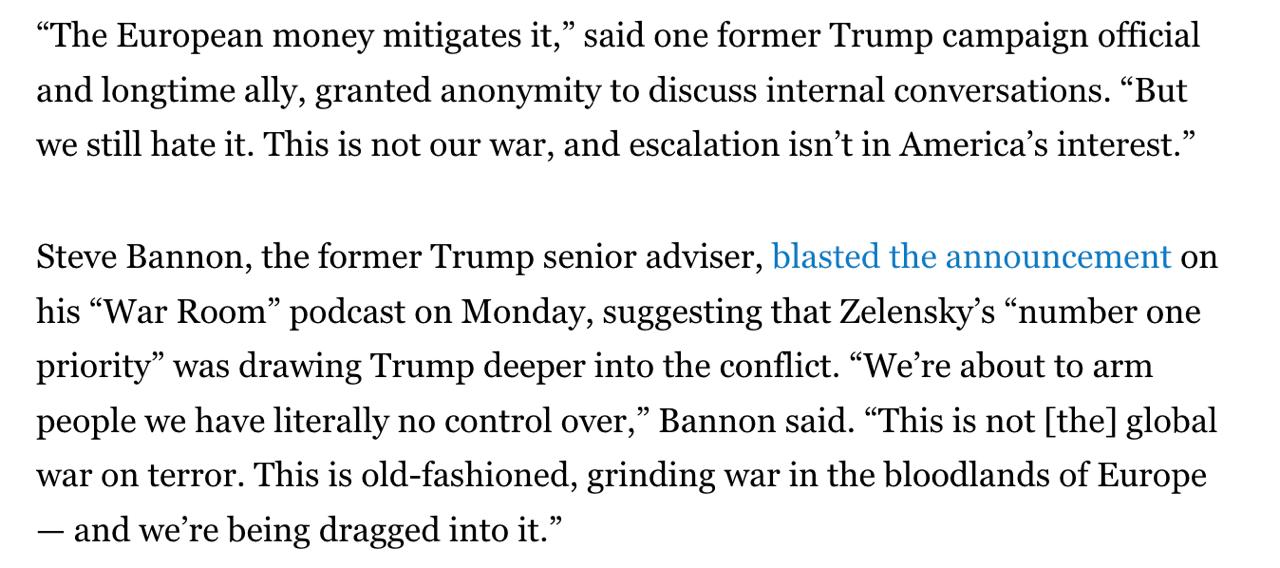 "Европейские деньги смягчают это. Но мы все еще ненавидим это. Это не наша война, и эскалация не в интересах Америки", - сказал один из бывших сотрудников предвыборного штаба Трампа, поддерживающих MAGA.