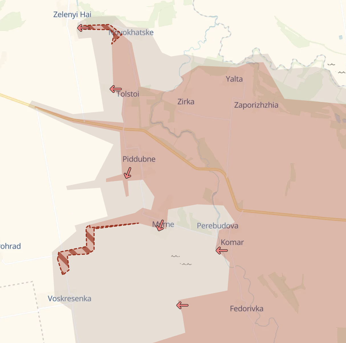 Армия РФ приблизилась к границе Днепропетровской области еще на двух участках, сообщает Deep State. Россияне резко продвинулись с Мирного к Воскресенке, а также зашли в Зеленый Гай.