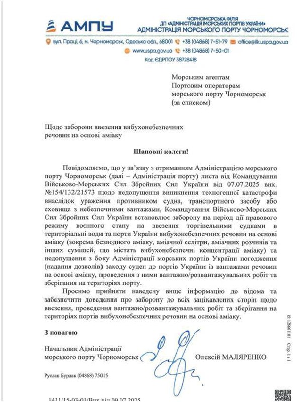 "Уведомляем, что в связи с получением администрацией морского порта Черноморск письма от командования Военно-морских сил ВСУ от 7.07.2025 о недопущении возникновения техногенной катастрофы вследствие поражения противником судна, транспортного средства или хранилища с опасными грузами командование Военно-морских сил ВСУ устанавливает запрет на период действия правового режима военного положения на ввоз торговыми судами в территориальные воды и порты Украины взрывоопасных веществ на основе аммиака", - сказано в уведомлении.