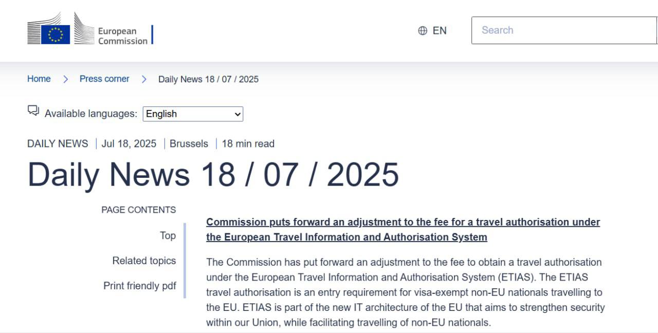 Еврокомиссия собирается повысить почти втрое плату за разрешение на поездку в Евросоюз в рамках Европейской системы информации и авторизации путешествий (ETIAS), которая заработает в конце 2026 года.