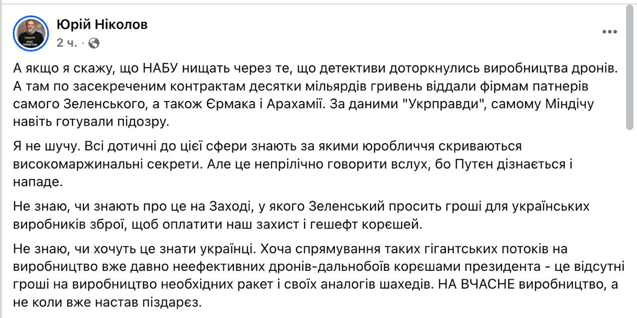 "А если я скажу, что НАБУ уничтожают из-за того, что детективы коснулись производства дронов. А там по засекреченным контрактам десятки миллиардов гривен отдали фирмам партнеров самого Зеленского, а также Ермака и Арахамии. По данным "Укрправды", самому Миндичу даже готовили подозрение. Не знаю, знают ли об этом на Западе, у которого Зеленский просит деньги для украинских производителей оружия, чтобы оплатить нашу защиту и гешефт корешей. Не знаю, хотят ли это знать украинцы. Хотя направление таких гигантских потоков на производство уже давно неэффективных дронов-дальнобоев корешами президента - это отсутствующие деньги на производство необходимых ракет и своих аналогов "Шахедов". На производство вовремя, а не когда уже наступил пи@дец", - пишет Николов.