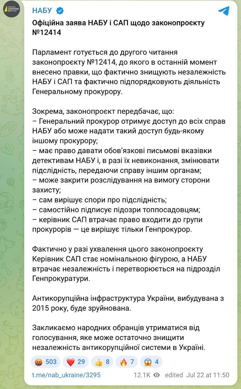 Национальное антикоррупционное бюро Украины и Специализированная антикоррупционная прокуратура опубликовали официальный комментарий с критикой законопроекта №12 414, который "может уничтожить независимость антикоррупционной системы в Украине".