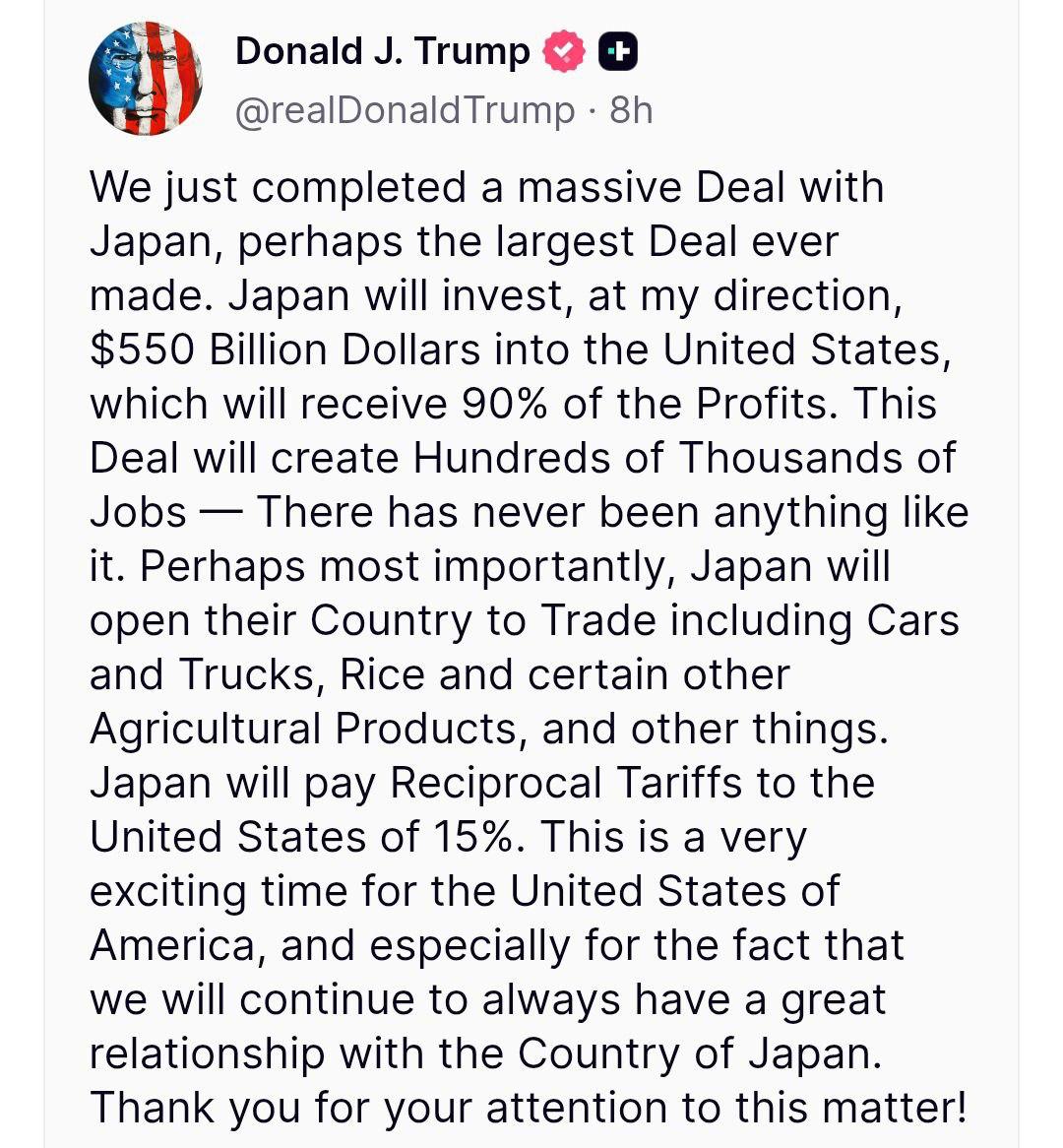 "Мы только что заключили грандиозную сделку с Японией — возможно, самую крупную в истории. По моему указанию Япония инвестирует 550 миллиардов долларов в Соединённые Штаты, и США получат 90% прибыли. Эта сделка создаст сотни тысяч рабочих мест — ничего подобного ещё не было", - сообщает американский глава.