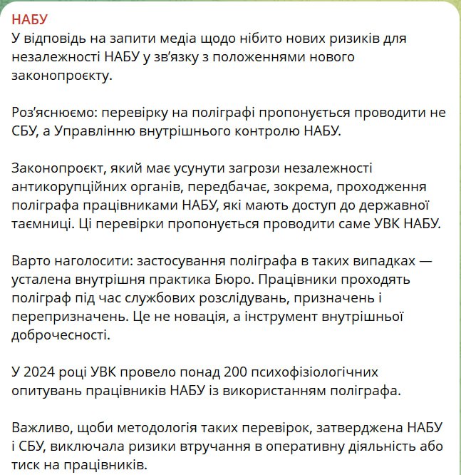 "Разъясняем: проверку на полиграфе предлагается проводить не СБУ, а Управлению внутреннего контроля НАБУ. Законопроект, который должен устранить угрозы независимости антикоррупционных органов, предусматривает, в частности, прохождение полиграфа работниками НАБУ, имеющими доступ к государственной тайне. Эти проверки предлагается проводить именно УВК НАБУ", – говорится в заявлении.