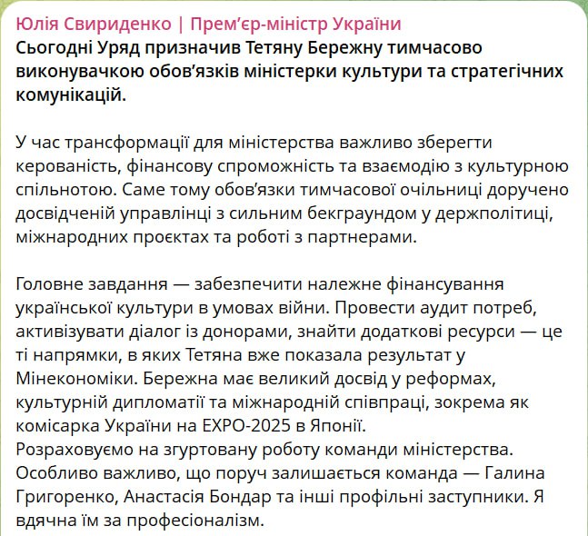 "Именно поэтому обязанности временного руководителя поручены опытному управленцу с сильным бэкграундом в госполитике, международных проектах и работе с партнерами. Главная задача — обеспечить финансирование украинской культуры в условиях войны. Провести аудит потребностей, активизировать диалог с донорами, найти дополнительные ресурсы — те направления, в которых Татьяна уже показала результат в Минэкономики. Бережная имеет большой опыт в реформах, культурной дипломатии и международном сотрудничестве, в частности, как комиссар Украины на EXPO-2025 в Японии", - заявила Свириденко.