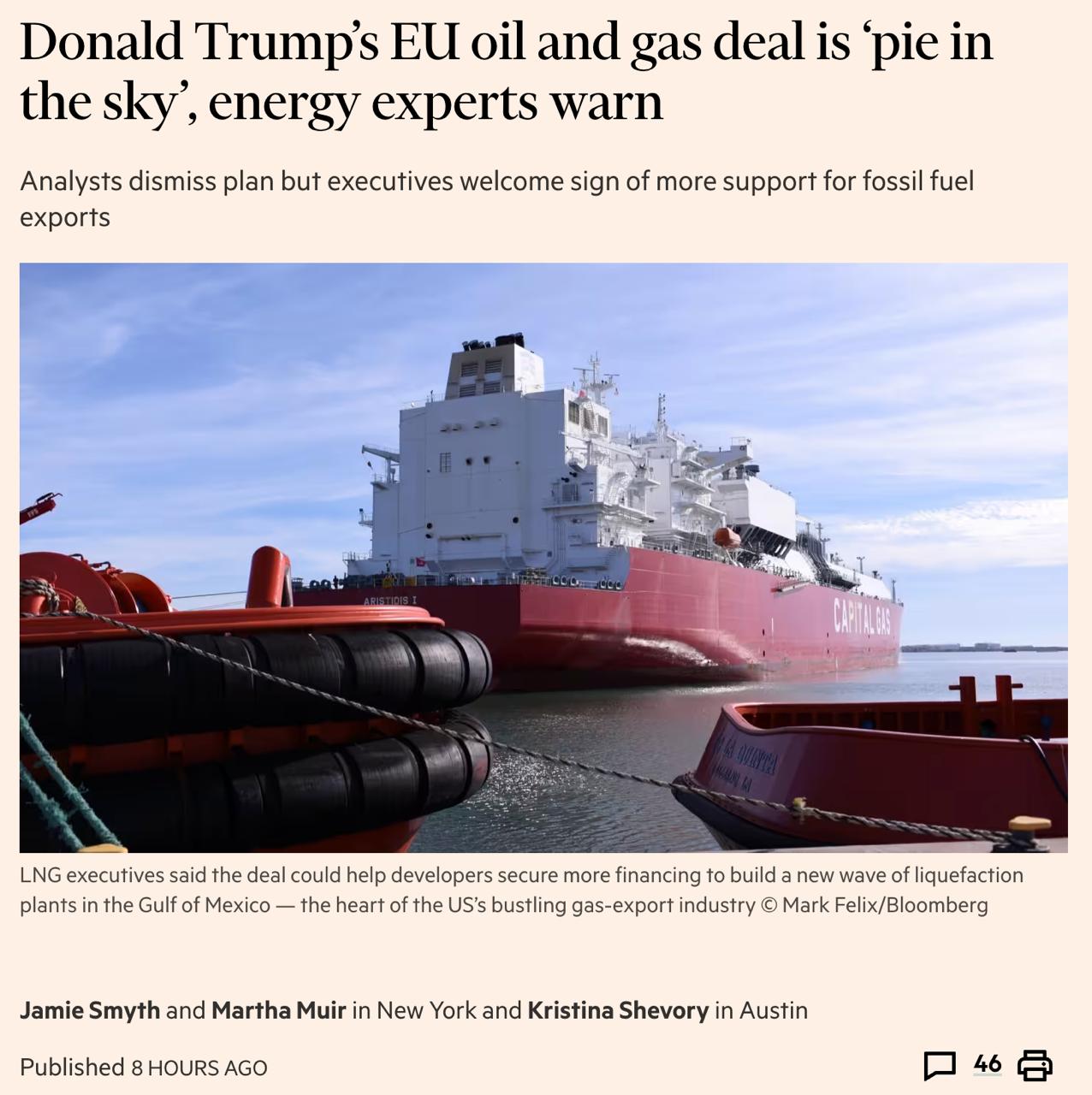Западные СМИ продолжают писать, что Европейский Союз вряд ли сможет реализовать условия торгового соглашения с США о закупке американских энергоносителей на 750 млрд долларов за три года.