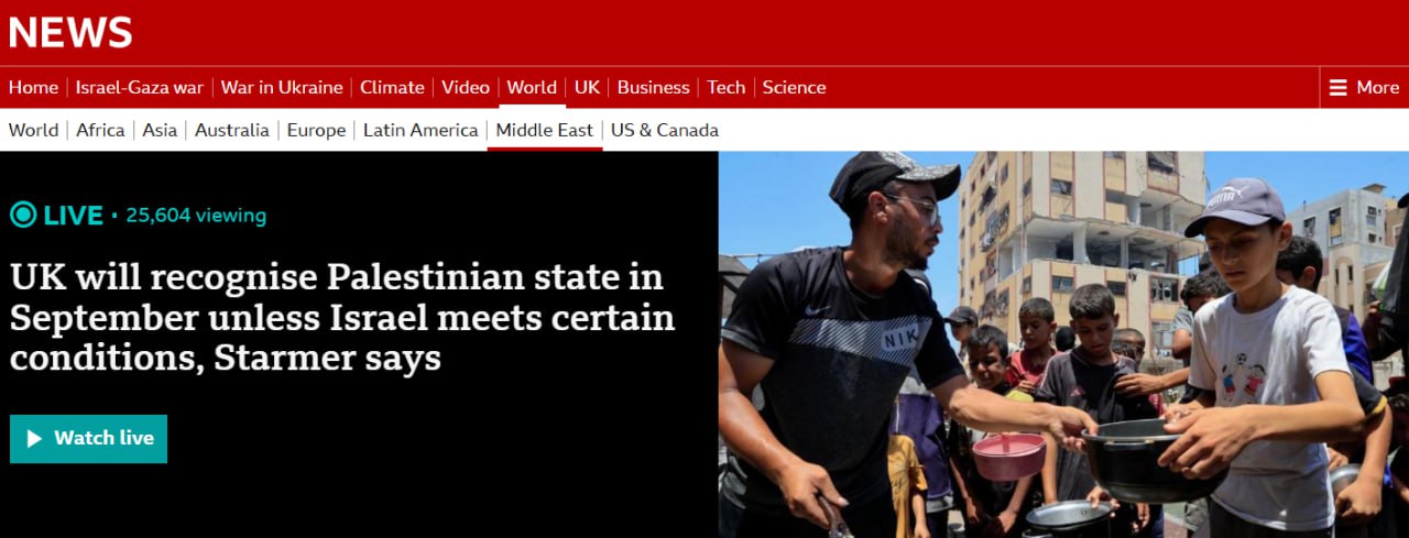 Великобритания признает Палестину как государство в сентябре – до Генеральной Ассамблеи ООН – если Израиль не предпримет существенных шагов для прекращения ужасающей ситуации в Газе.