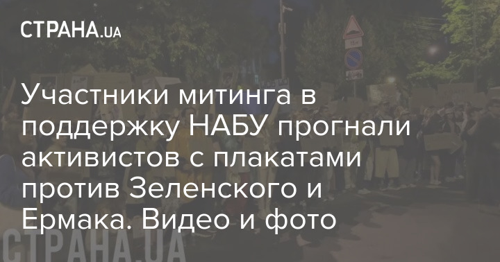 На акцию протеста в поддержку Национального антикоррупционного бюро Украины (НАБУ) под Офисом президента пришли около 10 человек, державших в руках плакаты против президента Владимира Зеленского и главы ОП Андрея Ермака. Они некоторое время находились среди участников митинга, скандируя речёвки так же, как и остальные.