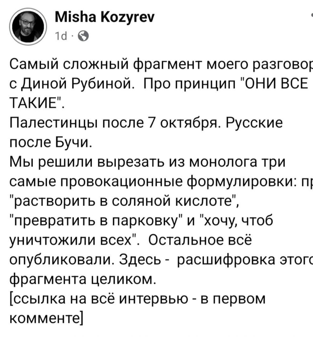 В интервью, фрагменты которого опубликовал журналист "Дождя" Михаил Козырев, Рубина заявила: "Израиль имеет право на самозащиту. Он имеет право растворить их всех в соляной кислоте. Он имеет право расчистить Газу и превратить её просто в парковку. Вот на что имеет право Израиль. Потому что там нет мирных жителей, нет! Я очень хочу, чтобы уничтожили всех. Возможно, я кого то шокирую. Я даже думаю, большинство народа я шокирую. Пусть".