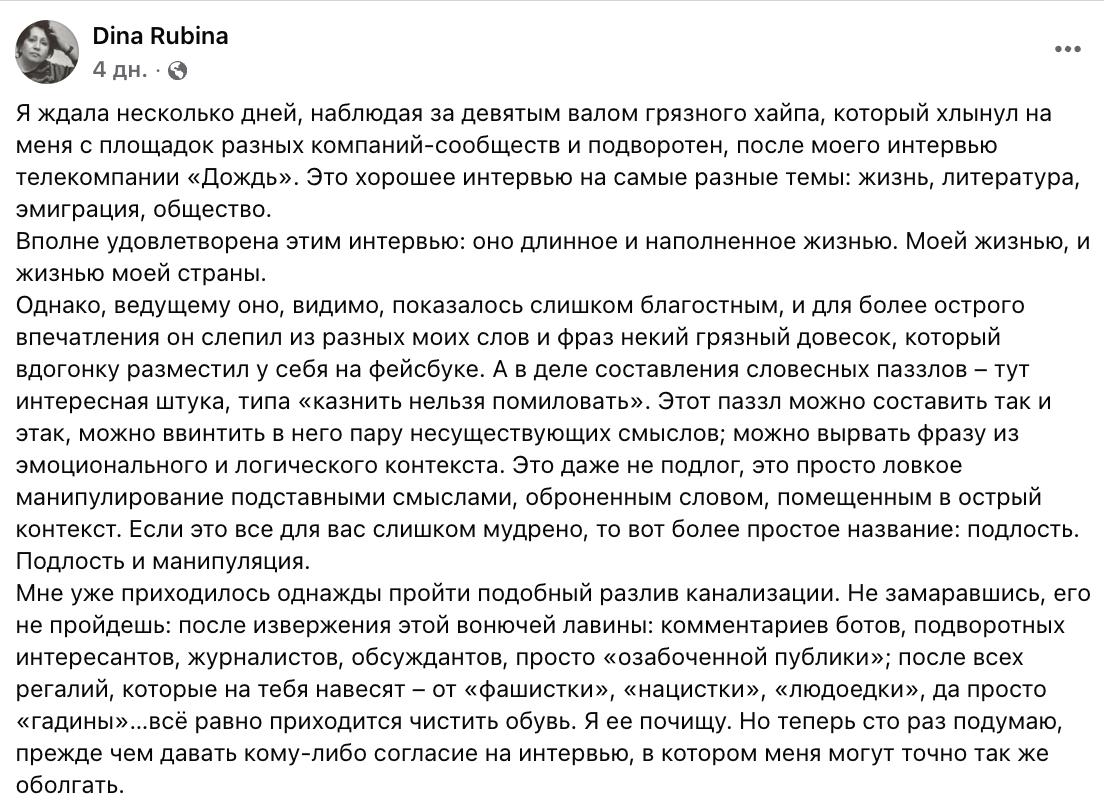 Позже тот удалил публикацию, извинившись перед Рубиной.
