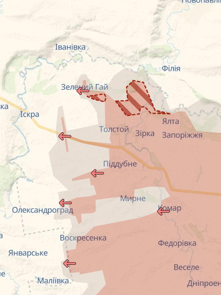 Армия РФ продвинулась у границы Днепропетровской области в районе Новохатского, серая зона подошла непосредственно к админгранице, свидетельствует карта Deep State.