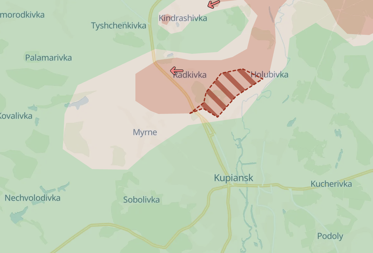 Также войска РФ продвинулись к северу от Купянска в районе Голубовки. Если посмотреть на карту, то цель движения россиян на данном участке фронта очевидна - окружить Купянск с востока. На карте DeepState видно, что зона боев (серая зона) охватила поселок мирный и приближается к Соболевке, с которой будет простреливаться главная дорога снабжения Купянска.