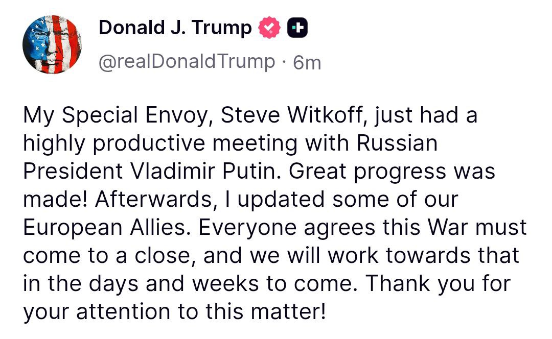 "Мой специальный посланник Стив Уиткофф только что провёл чрезвычайно продуктивную встречу с президентом России Владимиром Путиным. Был достигнут большой прогресс! После этого я проинформировал некоторых наших европейских союзников. Все согласны с тем, что эта война должна закончиться, и мы будем работать над этим в ближайшие дни и недели", - написал президент США.