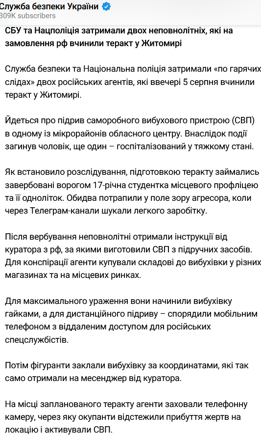 Заявляется, что двое 17-летних жителей Житомира – студентка профлицея и ее знакомый – изготовили самодельную бомбу "по инструкциям из России", начинили ее гайками и снарядили телефоном для дистанционного подрыва, после чего разместили в месте, указанном кураторами.