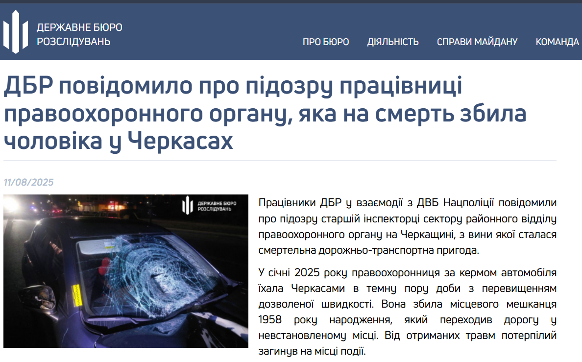 Государственное бюро расследований сообщило о подозрении правоохранительнице, которая еще в январе сбила насмерть мужчину в Черкассах.